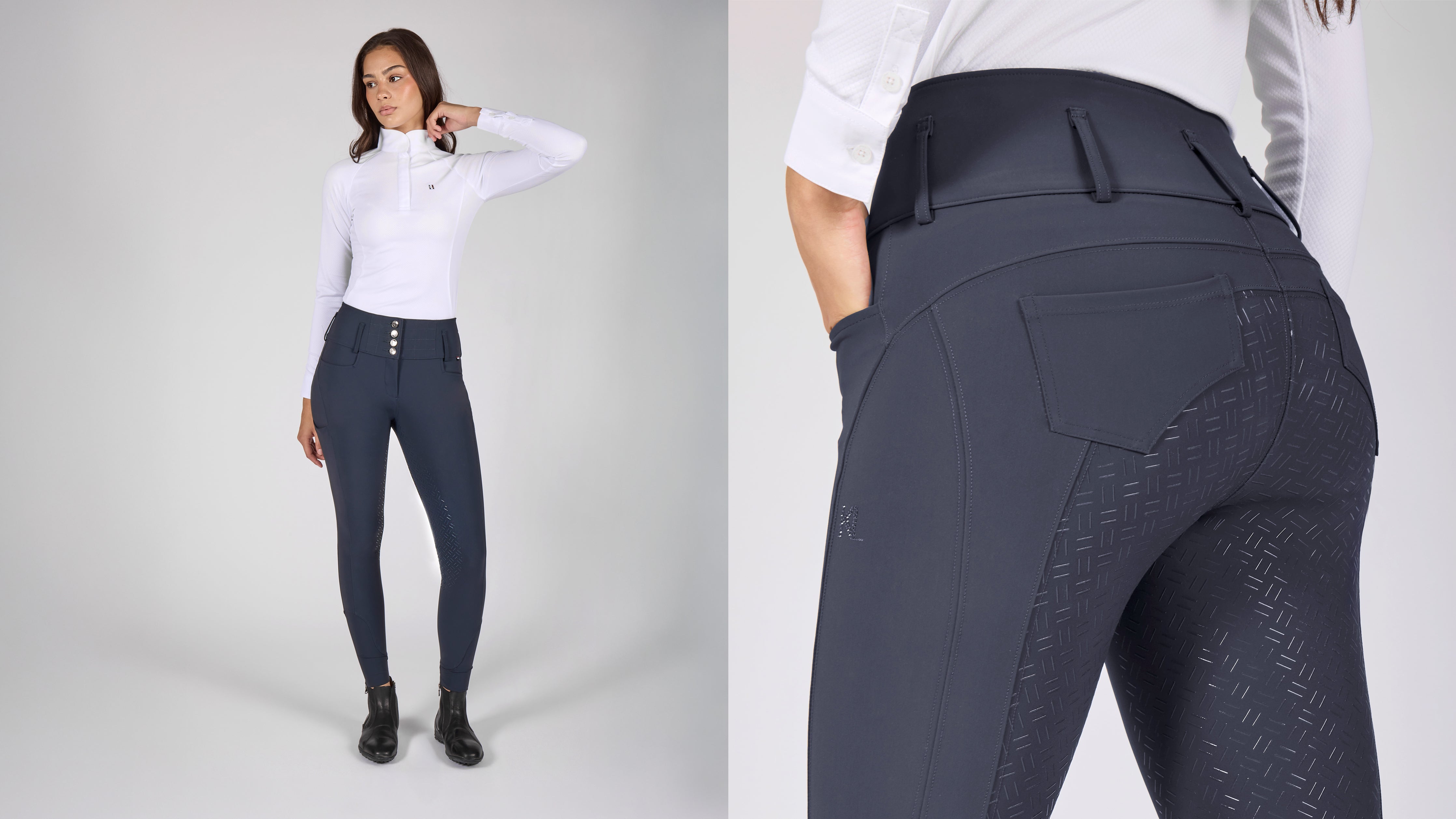 It’s crucial that our breeches are breathable and come with quick-drying technology, we even offer breeches that are dust and grease repellent, so you are always left looking your best, no matter what the horse kicks up/dirt at the track/or horse things that cause grease. We care about the details, and we create every piece of clothing with passion and innovation. Our breeches come in a gorgeous selection of colors and fabrics with fashionable buttons, discrete embroidery, and striped piping for a pop of color, or glitter-lined pockets and waistbands for an extra flair.